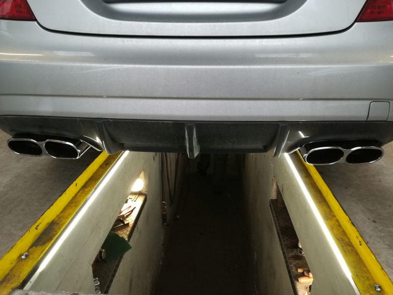 Nasza realizacja polegała głównie na wymianie starego i stworzeniu nowego układu wydechowego. Klient otrzymał nowy, tworzony na zamówienie układ stworzony ze stali kwasoodpornej a także dedykowane końcówki o dosyć masywnym kształcie, z podziałem na cztery rury. Za pomocą dokonanych modyfikacji Mercedes zmienił dźwięk.