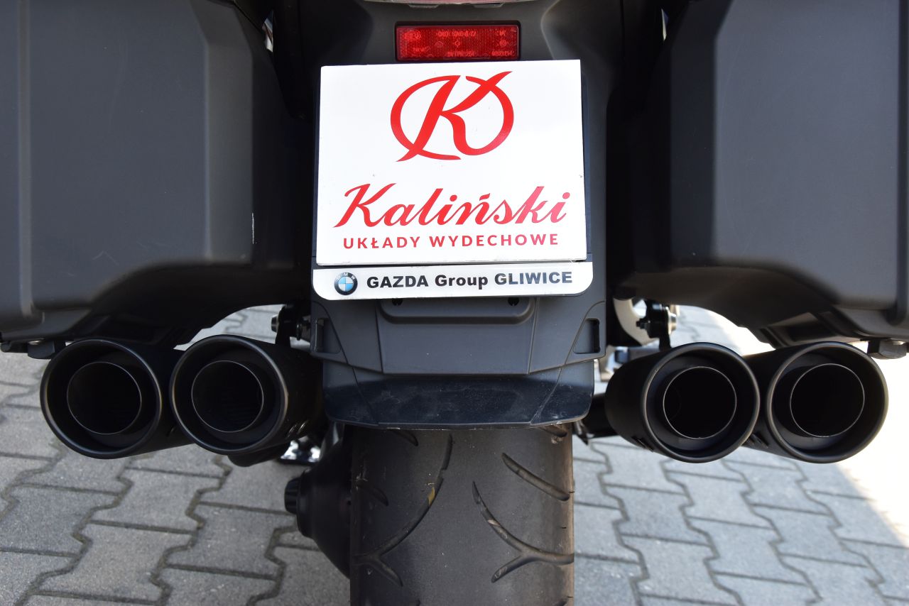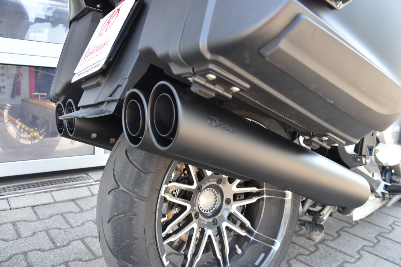 Motocykl standardowo wyposażony jest w dwa cylindryczne tłumiki o dużej średnicy. Mimo sporej mocy motocykla tłumiki nie wyglądają okazale, srebrny kolor nie wyróżnia ich spośród innych podzespołów. W ramach naszej modyfikacji układu wydechowego tłumiki BMW K1600 GTL zyskały aż dwie rury wylotowe więcej a całość składa się z czterech rur. Zmienił się również kolor tłumików, które zostały wykonane w kolorze czarnym, matowym. Zmiany bardzo okazale wyeksponowały nowe tłumi a całemu motocyklowi nadały masywniejszy wygląd.